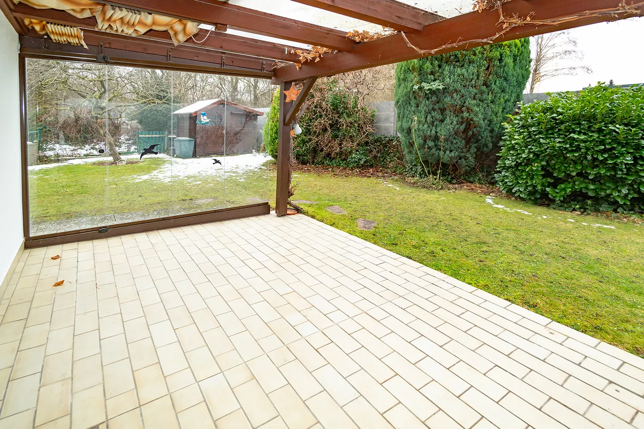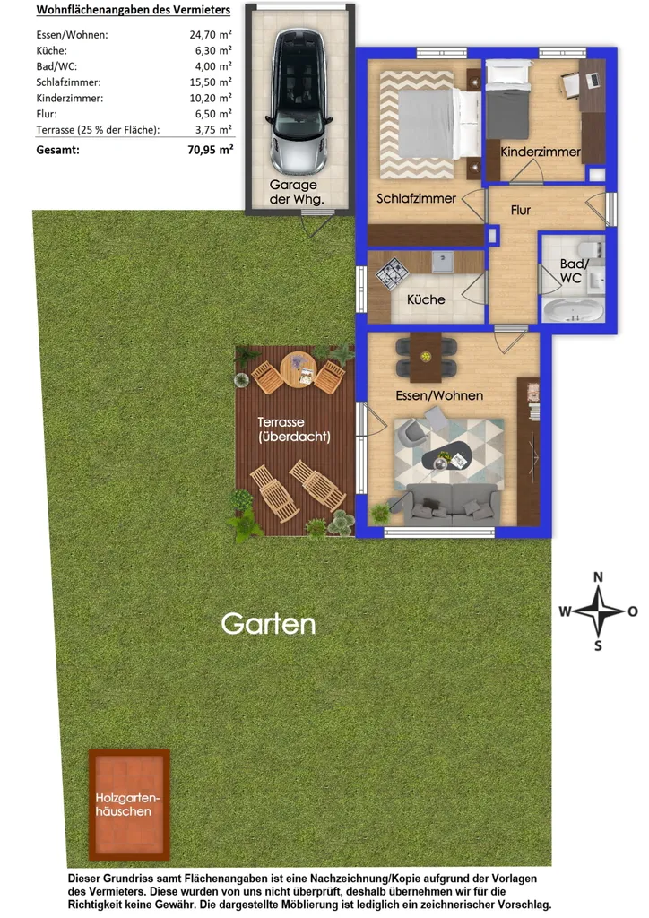 In der angegebenen Wohnfläche ist die überdachte Terrasse mit ihrer Gesamtgröße von ca. 15 m² nur mit 25 % berücksichtigt (3,75 m²).