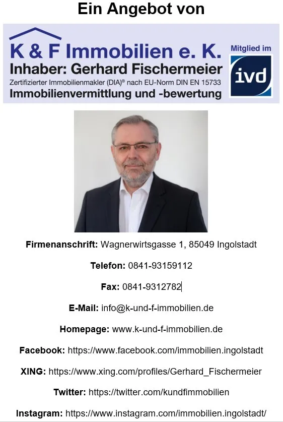 Haben wir Ihr Interesse geweckt? Schauen Sie sich die Immobilie vorab bequem von zu Hause aus an. Unsere Objektbeschreibung, die Bilder und Pläne, die 360°-Tour und das Immobilienvideo auf unserer Homepage gewähren Ihnen Einblicke. Für Rückfragen und Besichtigungen steht Ihnen der Firmeninhaber des Maklerbüros, Herr Gerhard Fischermeier, unter der Telefonnummer 0841-93159112 gerne zur Verfügung.