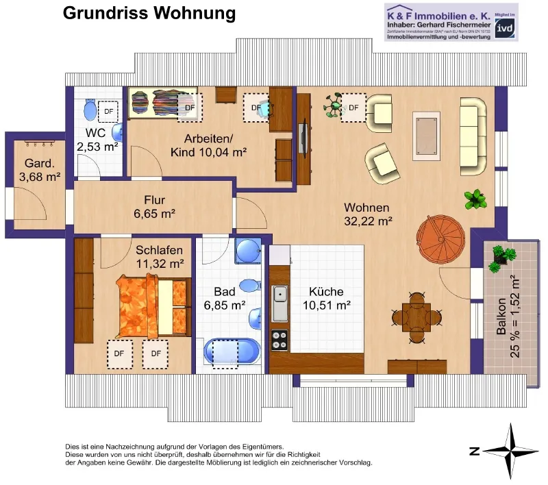 Alle Angaben stammen vom Eigentümer und/oder von Dritten. Eine Überprüfung dieser Angaben wurde von der K & F Immobilien e. K. nicht vorgenommen. Für deren Richtigkeit übernimmt die K & F Immobilien e. K. keine Gewährleistung/Haftung und schließt sie aus. Vom Ausschluss ausgenommen ist die Haftung für Leib, Leben und Gesundheit. Der Käufer ist verpflichtet, sich selbst von der Richtigkeit der Angaben vor dem Kauf zu überzeugen. Das gilt auch für alle Beschaffenheitsangaben (wie z. B. Baujahr, Flächenangaben, Grundrisse, Zustand usw.). Irrtum und Zwischenverkauf vorbehalten. Dieses Exposé ist eine Vorinformation. Als Rechtsgrundlage gilt allein der Kaufvertrag.