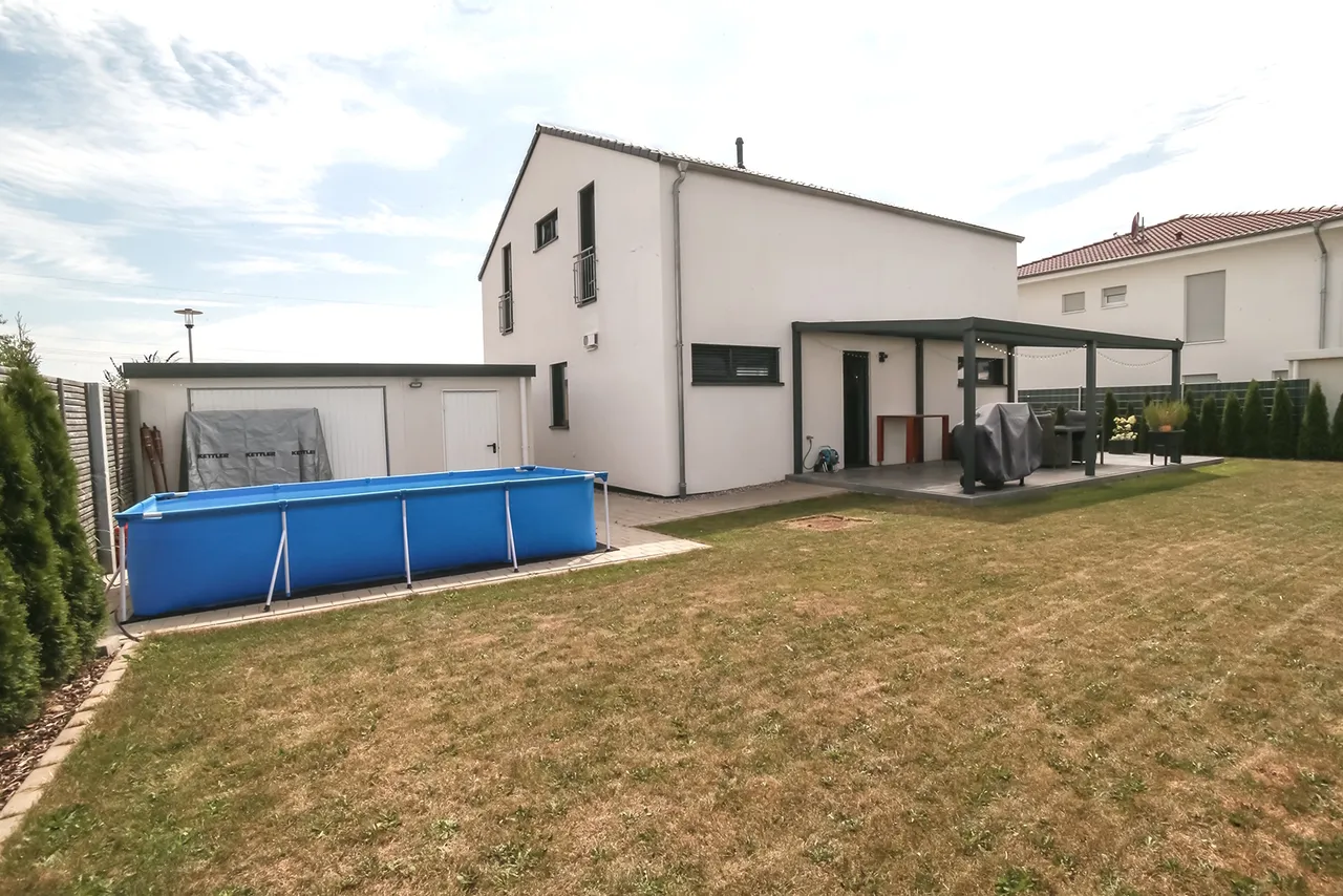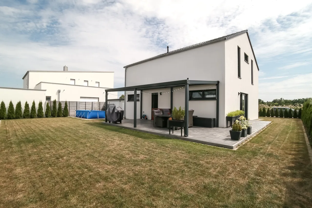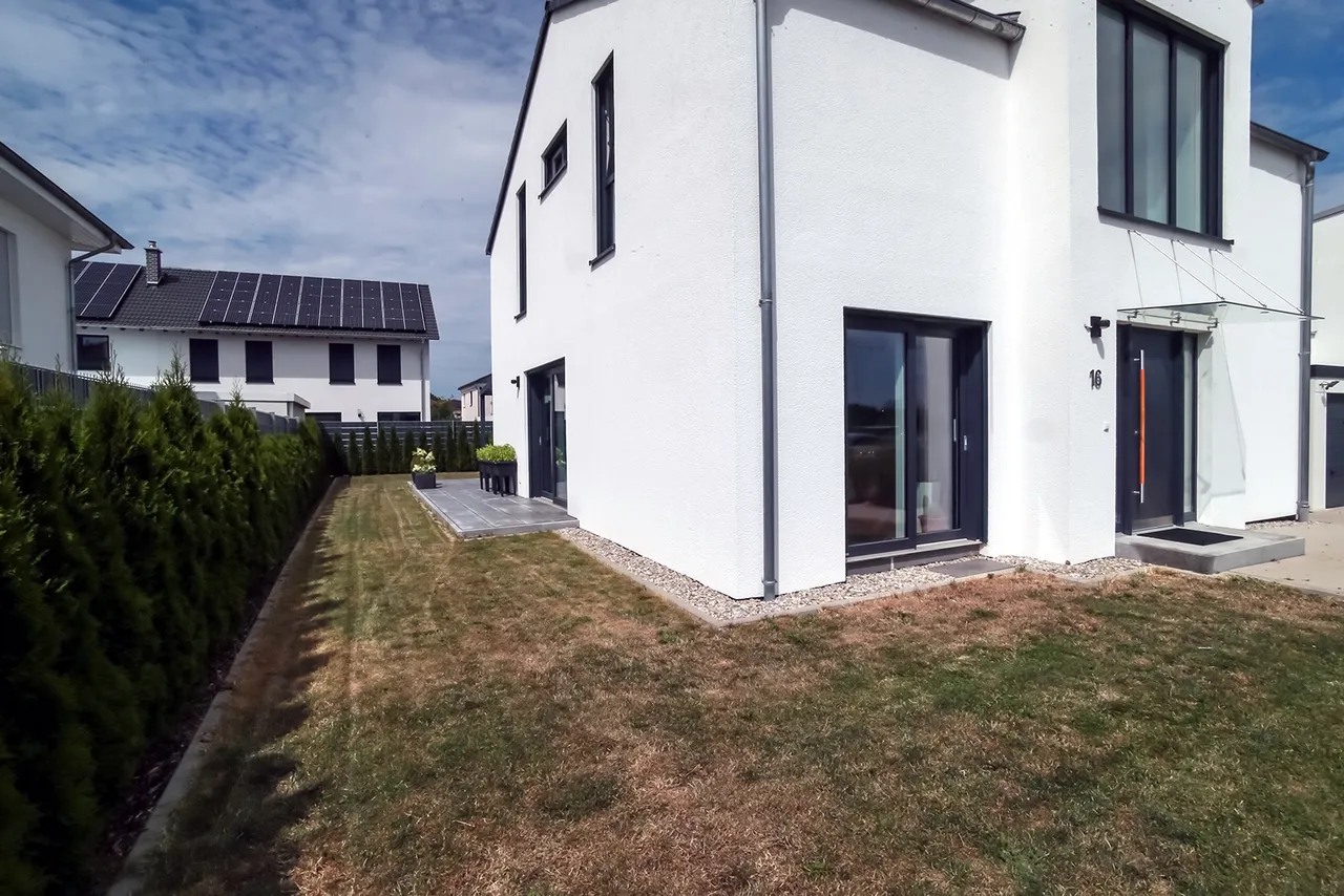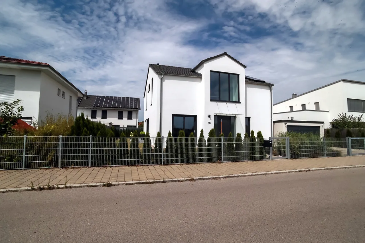 Sie finden hier ein energieeffizientes Einfamilienhaus vor, welches mit moderner Architektur inkl. hohen Fassaden und viel Licht besticht. Die Bauweise besteht aus einer massiven Holzverbundkonstruktion der Firma "MASSAHAUS". Die Außenwände sind als "Klima-Plus-Wand" seitens des Herstellers bezeichnet.