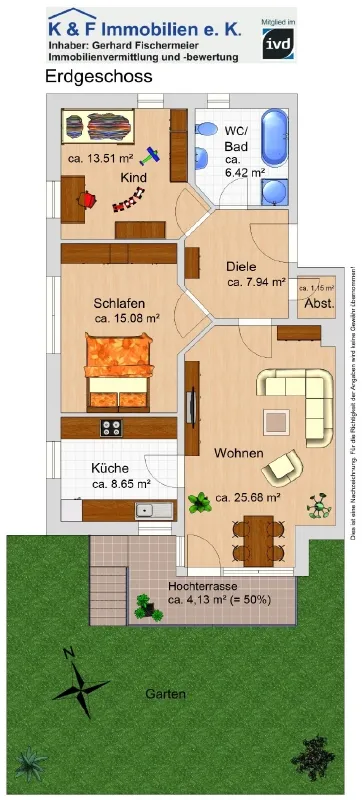 Alle Angaben stammen vom Eigentümer und/oder von Dritten. Eine Überprüfung dieser Angaben wurde von der K & F Immobilien e. K. nicht vorgenommen. Für deren Richtigkeit übernimmt die K & F Immobilien e. K. keine Gewährleistung/Haftung und schließt sie aus. Der Käufer ist verpflichtet, sich selbst von der Richtigkeit der Angaben vor dem Kauf zu überzeugen. Das gilt auch für alle Beschaffenheitsangaben (wie z. B. Baujahr, Flächenangaben, Grundrisse, Zustand usw.). Irrtum und Zwischenverkauf vorbehalten. Dieses Exposé ist eine Vorinformation. Als Rechtsgrundlage gilt allein der Kaufvertrag.