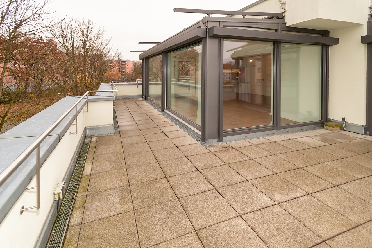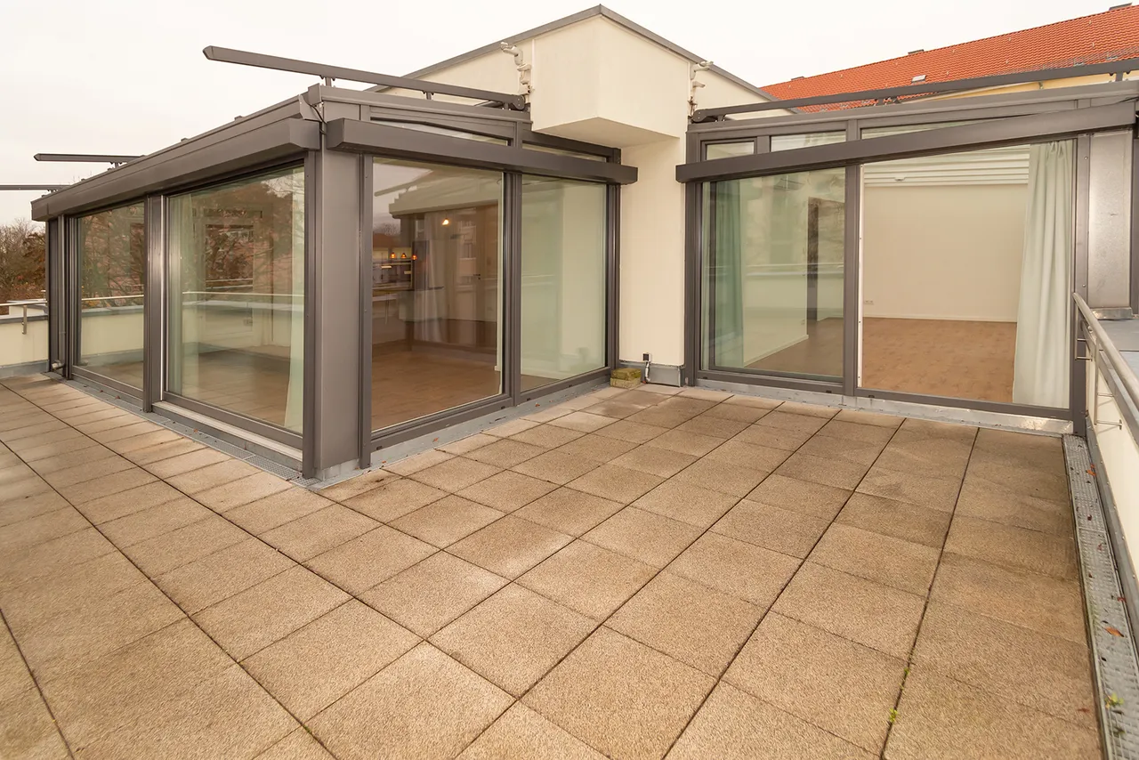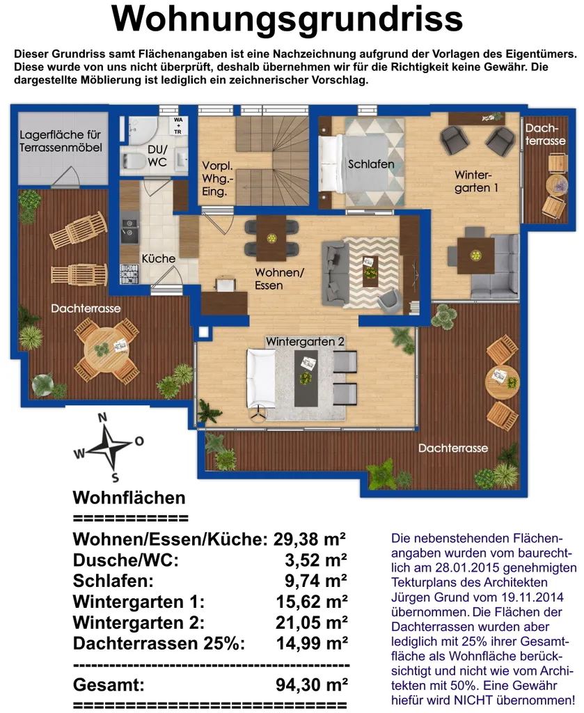 In der angegebenen Wohnfläche sind die beiden Wintergärten mit ihrer Gesamtfläche, die Flächen der Dachterrassen aber lediglich mit 25 % der Gesamtfläche berücksichtigt. Die angegebene Nutzfläche bezieht sich auf das Kellerabteil sowie das Gartenhäuschen auf der Dachterrasse und den Vorplatz zum Wohnungseingang.