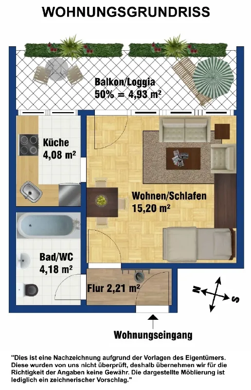 In der angegebenen Wohnfläche ist der Balkon/Loggia mit der Hälfte der Fläche berücksichtigt.
