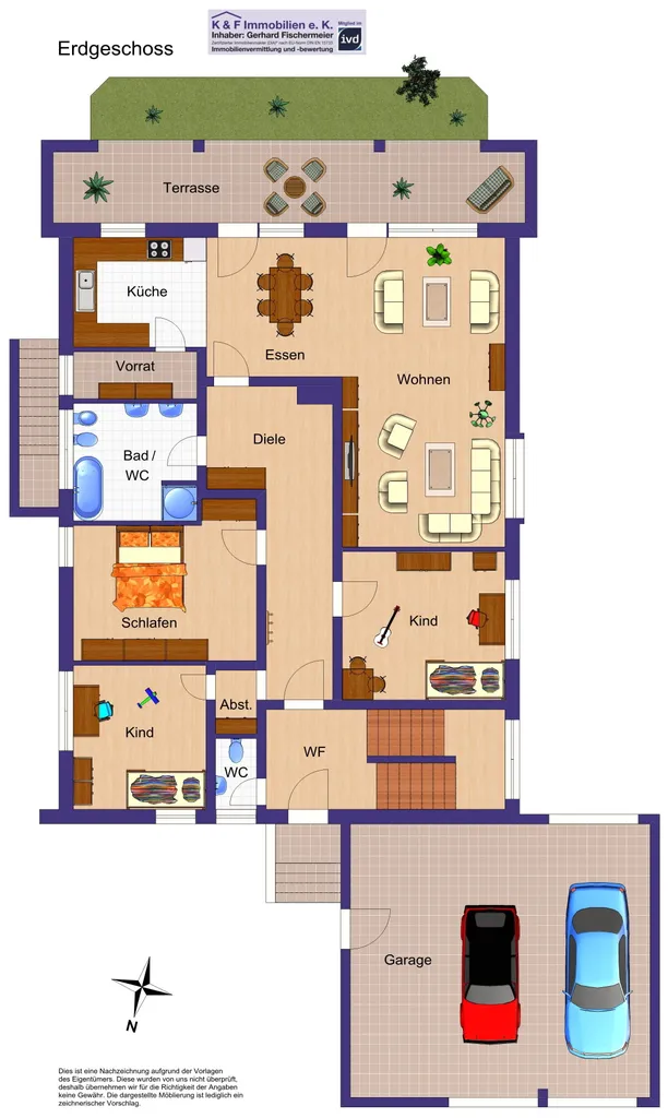 Alle Angaben stammen vom Eigentümer und/oder von Dritten. Eine Überprüfung dieser Angaben wurde von der K & F Immobilien e. K. nicht vorgenommen. Für deren Richtigkeit übernimmt die K & F Immobilien e. K. keine Gewährleistung/Haftung und schließt sie aus. Der Käufer ist verpflichtet, sich selbst von der Richtigkeit der Angaben vor dem Kauf zu überzeugen. Das gilt auch für alle Beschaffenheitsangaben (wie z. B. Baujahr, Flächenangaben, Grundrisse, Zustand usw.). Irrtum und Zwischenverkauf vorbehalten. Dieses Exposé ist eine Vorinformation. Als Rechtsgrundlage gilt allein der Kaufvertrag.