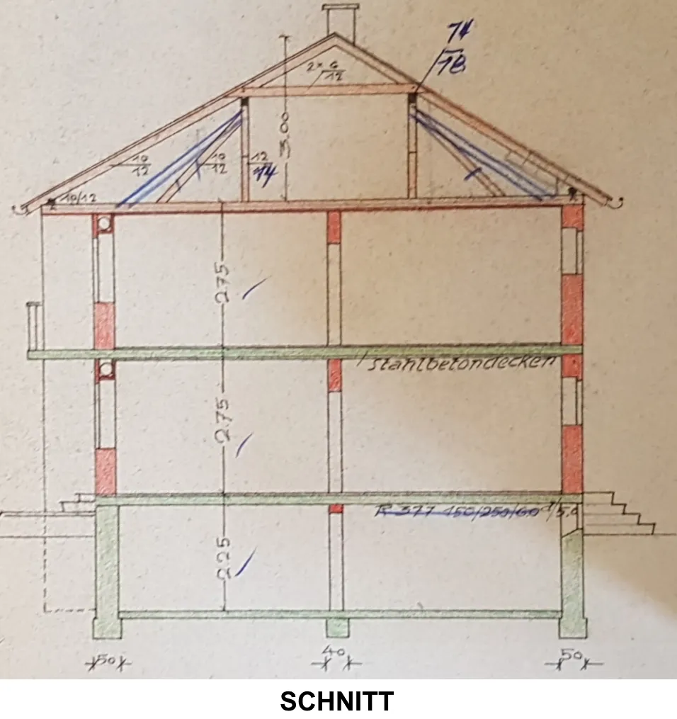 Das in Massivbauweise errichtete Wohnhaus ist sanierungs-/renovierungsbedürftig. Lediglich die Fenster wurden im Jahr 2006 ausgetauscht (weiße Kunststofffenster). Folgende Etagen finden Sie vor: Kellergeschoss, Erdgeschoss, Obergeschoss, Speicher